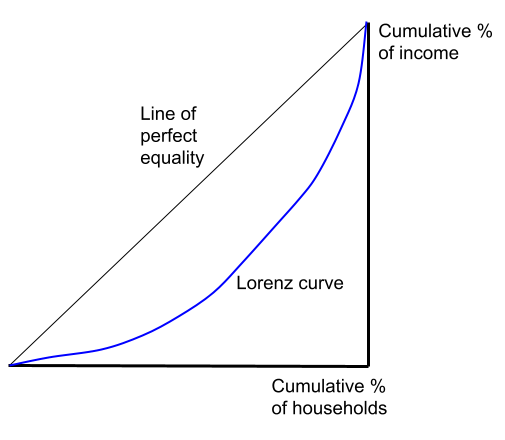 An alternative approach to this would be to use taxes and welfare benefits to reduce inequality. A progressive taxation system would be needed, where those on higher incomes pay not only a higher amount of tax, but a higher proportion of their income. So for example in the UK the basic rate of tax is 20%, but the highest earners pay up to 45% on additional income earned. This could be coupled with a generous system of welfare benefits – paying people directly if they are unemployed or in particularly low wage jobs. The combination of these policies would be to reduce inequality in disposable incomes – the expectation would be for the Lorenz curve to shift left, closer to the line of perfect equality.